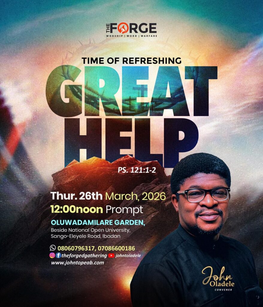 Special announcement, on Thursday, 26th of March, 2026, by 12:00 noon, we’ll be coming together for our Time of Refreshing programme, theme: Great Help, Time, between 12:00 and 2:00p.m, at Oluwadamilare Garden beside National Open University, behind TAFO Arena at Ijokudu Junction, Songo-Elele Road. Mark that date in your diary.